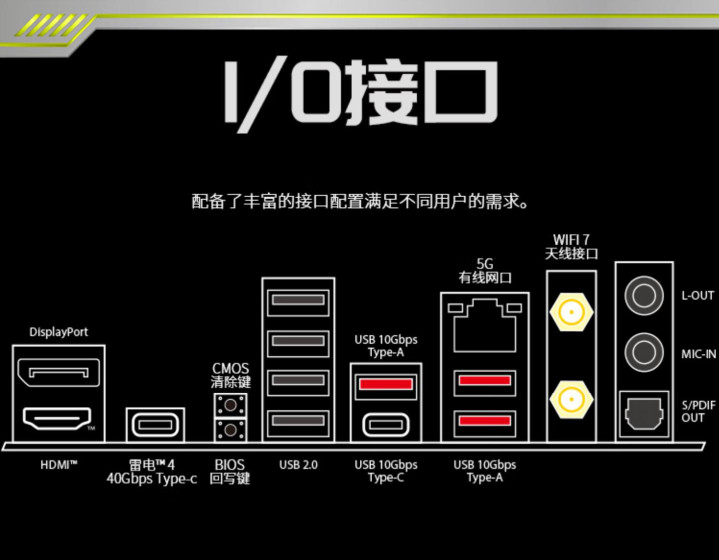 主板后置I/O接口也相当丰富,提供多达七组USB TYPE-A接口,还包括两组Type-C,其中一组还是千元B860极其罕见的雷电4。网络配置方面是有线5G+无线Wi-Fi7,属于主打电竞的Killer品牌。音频方面则配备三组包含S/PDIF光纤输出,主板还有方便用户调试的Flash BIOS和Clear BIOS按钮。