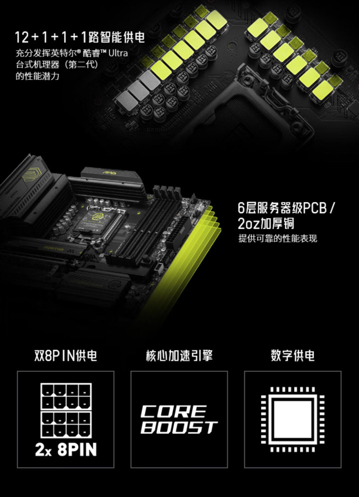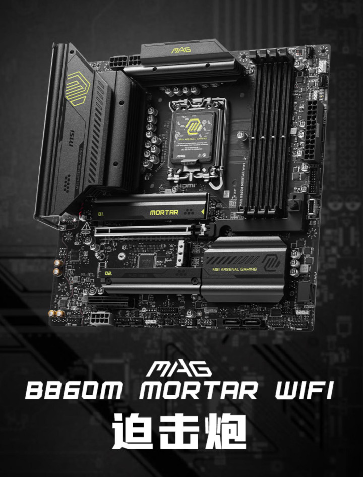 微星MAG B860M MORTAR WIFI(迫击炮)全面覆盖扩展型VRM散热片,内置7W/mK导热垫,供电体系达到了12+1+1+1路,CPU部分的Dr.MOS最大电流支持到60A,配备6层服务级PCB、双8PIN CPU供电接口,可最大程度确保英特尔酷睿Ultra 5 230F稳定运行,为长时间满载提供扎实供电保障。