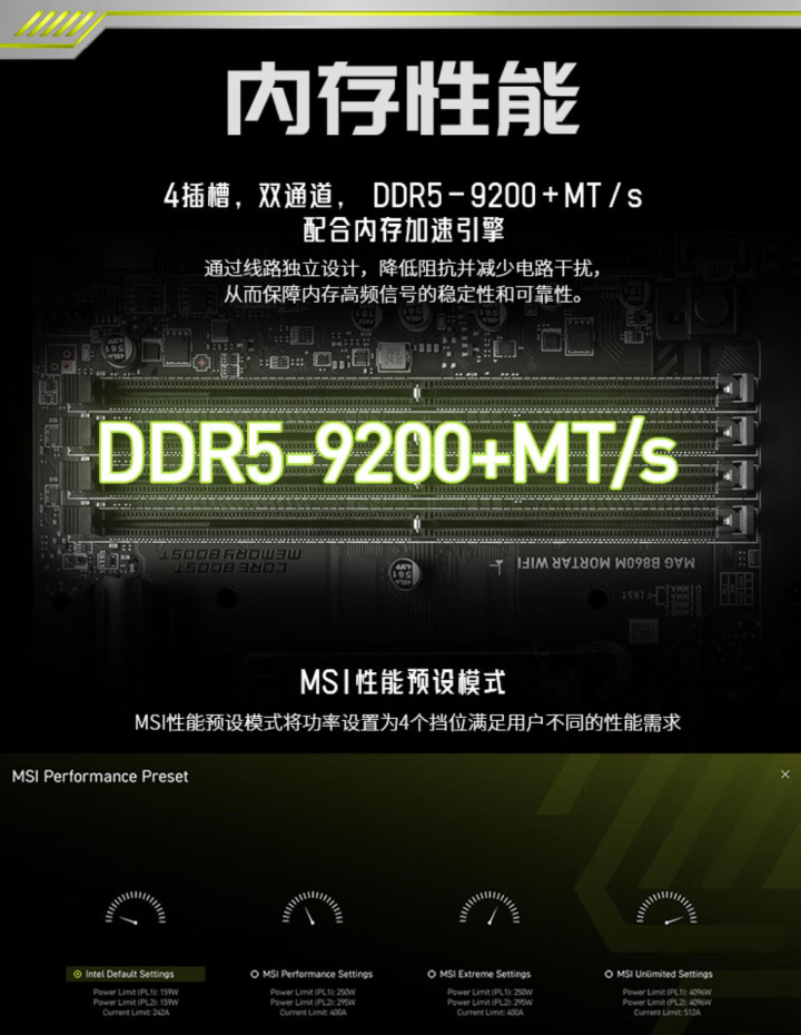 主板拥有四根DDR5内存插槽,最高可支持9200Mhz+MT/s,BIOS内还提供了High-Efficiency Mode、Memory Try It等专属优化功能,对于不懂调试的用户来说,也能实现一键优化提升内存性能。
