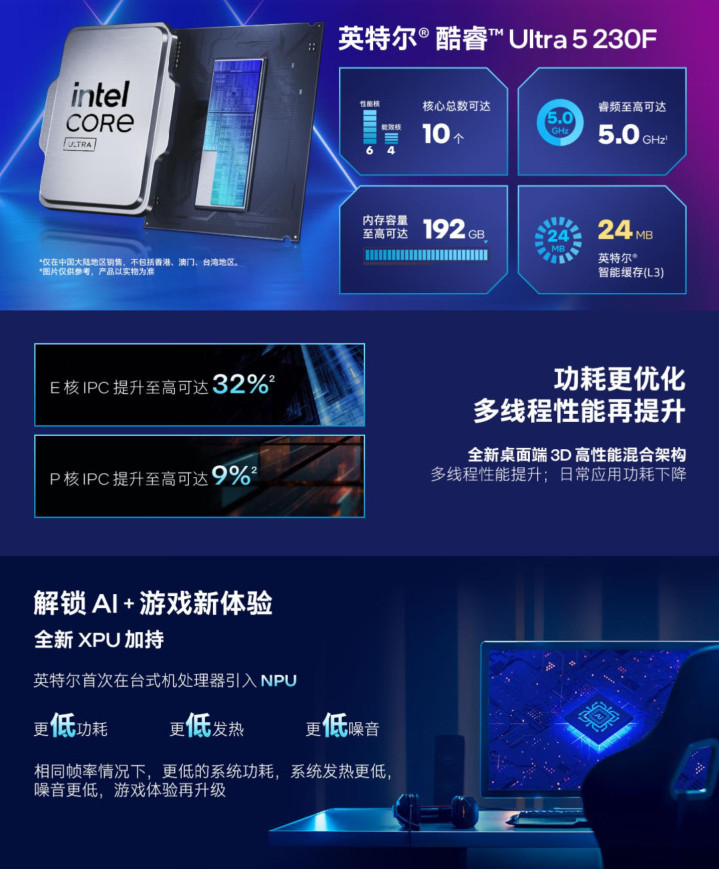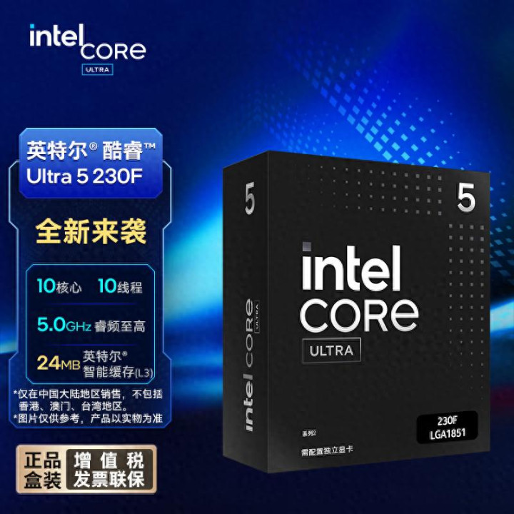 英特尔酷睿Ultra 5 230F基于新一代Arrow Lake-S架构和台积电N3B工艺打造,采用6个P核+4个E核,总计10核10线程,P核最大睿频可达到5GHz,E核最大睿频则是4.4GHz,三级缓存达到24MB,之所以没有超线程加持,是因为E核IPC提升已经足够大,最大睿频功耗仅121W,百元以内的散热器即可轻松压制。