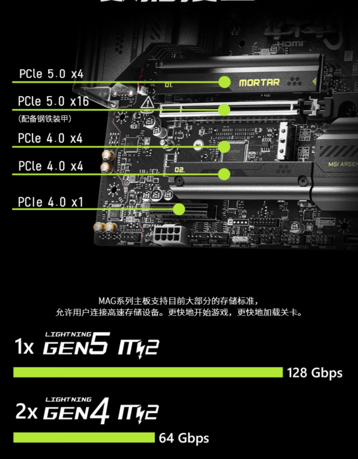 微星MAG B860M MORTAR WIFI(迫击炮)配备一根钢铁装甲加固的PCIe 5.0X16显卡插槽,并配备显卡快拆按钮。存储扩展则提供了多达三组M.2插槽,包括1组GEN5和2组GEN 4,GEN5插槽出厂自带免工具M.2冰霜铠甲,中间的插槽则是巧妙的留空设计——能完美兼容一些拆解就失去保修的马甲SSD。