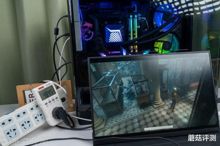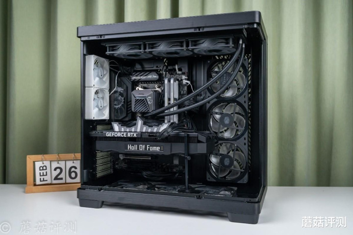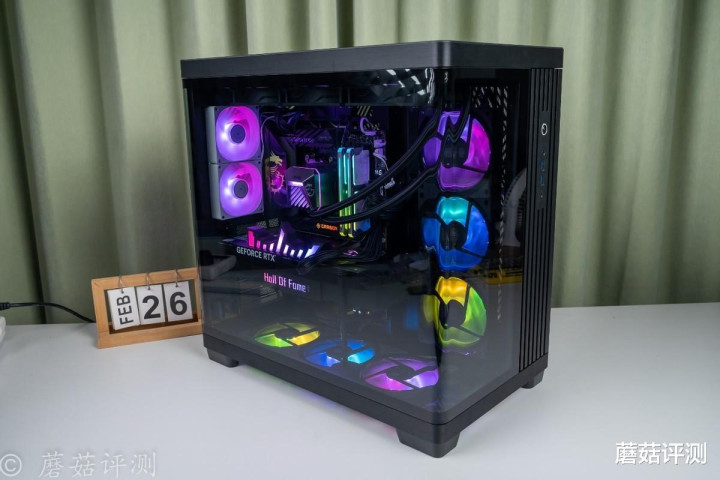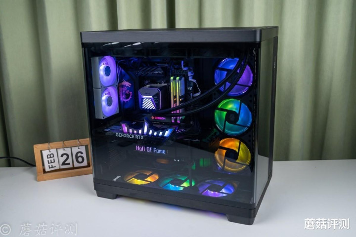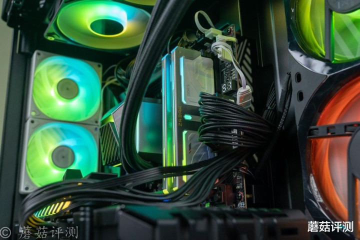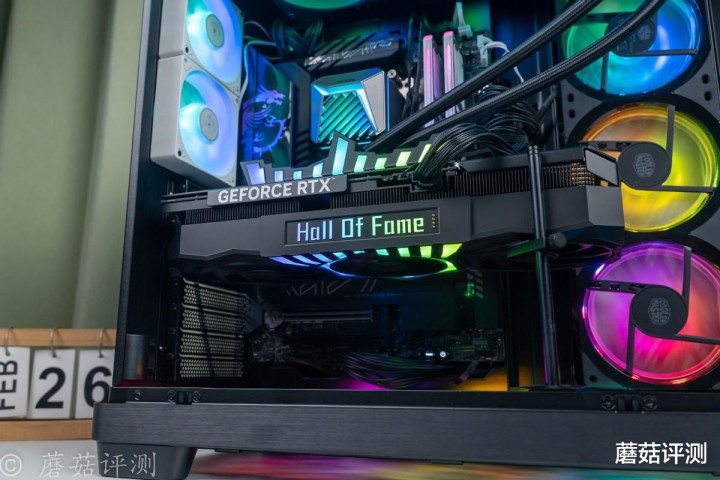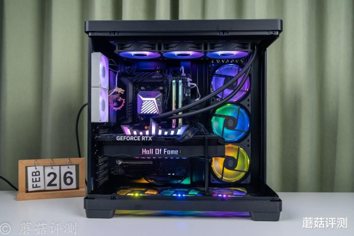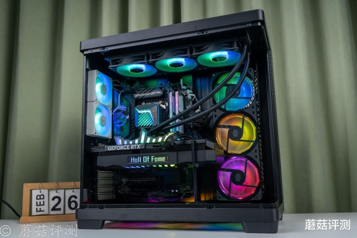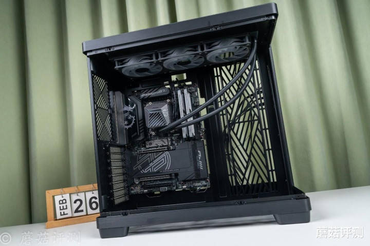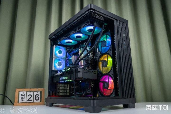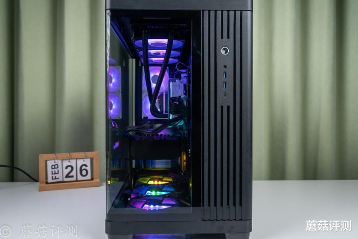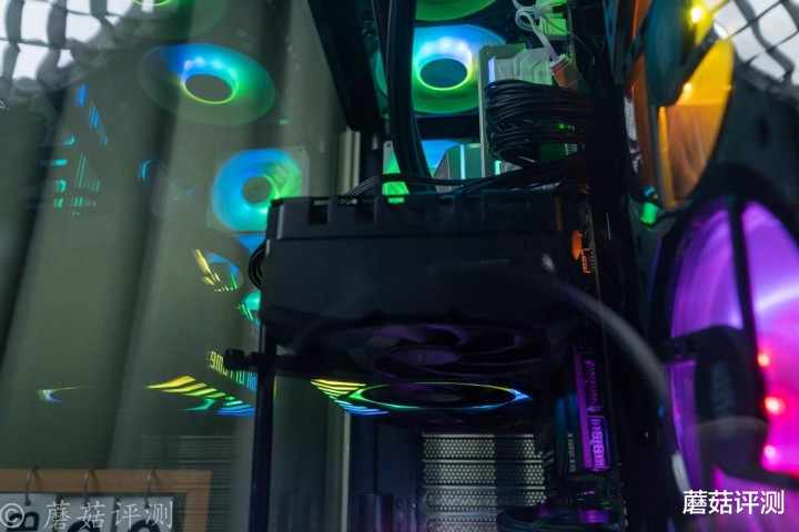 ▼靠近一些,这种感觉会更加明显,各种硬件“悬浮”在机箱内部,有点赛博朋克的感觉。