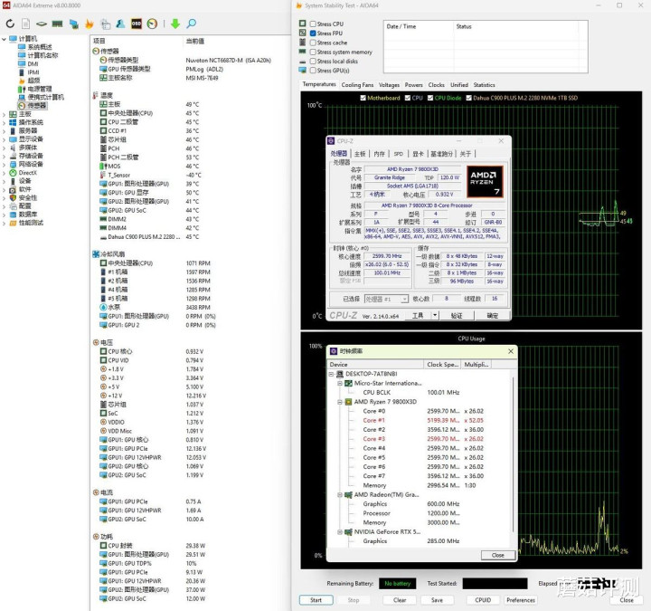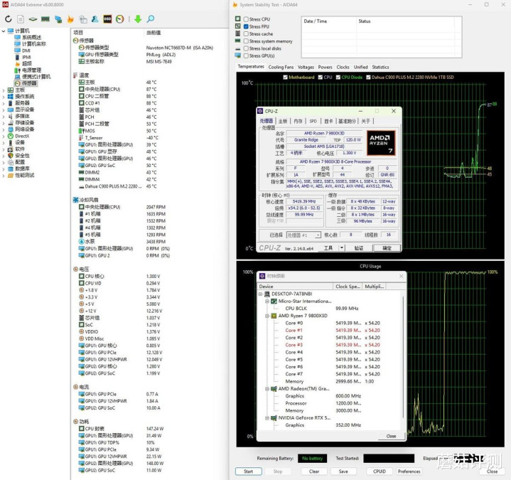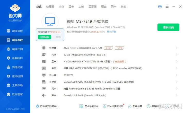 ▼整机配置一览,处理器是9800X3D,显卡是RTX 5070 Ti,硬件配置很不错了。
