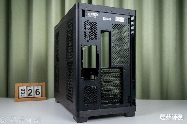 ▼机箱背面是金属背板,左右两侧各有两个面积巨大的格栅,内部标配防尘网,通风效果不错。