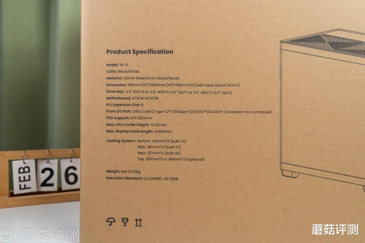 ▼纸箱正面右侧是机箱的外观,左侧是详细参数,其中散热高度支持到175mm,显卡长度支持到460mm,内部空间很大。