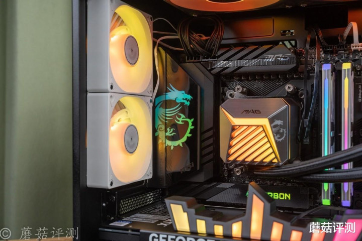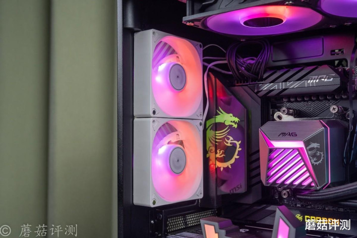 ▼微星这款A15水冷,水冷头和冷排风扇也支持ARGB灯效,且柔光效果不错,颜色过渡均匀。