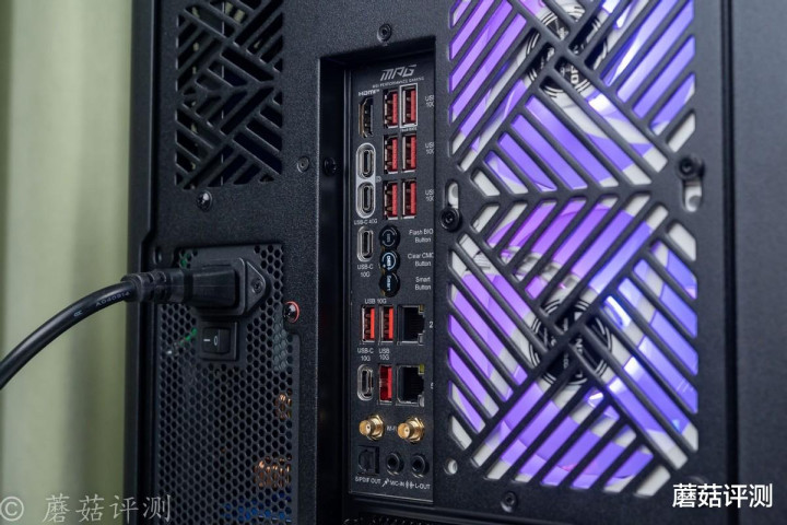 ▼IO接口方面,这块主板的表现也非常出色,各种Type-C接口、Type-A接口超级丰富,中间还有三个物理按键,用于刷写BIOS、擦除BIOS和开启Smart模式,日常超频、升级BIOS非常方便。