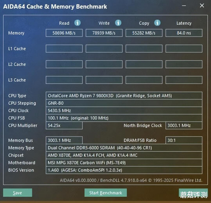▼内存默认打开EXPO,频率稳定在6000MHz,时序40-40-40-96。跑个内存的读写测试,内存读取速度58696MB/s、写入速度在78939MB/s、复制速度55282MB/s,延迟84ns。
