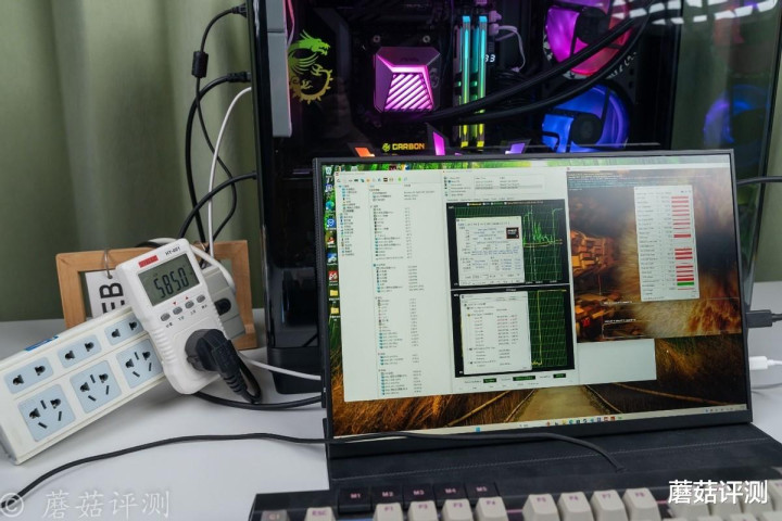 ▼这个时候的整机输入功耗在585W左右,还不错。如果按照转换率90%来计算的话,这个时候的整机功耗在526.5W左右,距离电源额定功率650W,还有123.5W左右的剩余,还不错。