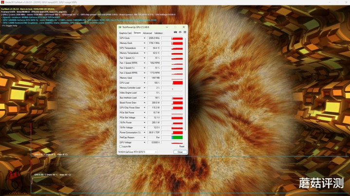 ▼跑个甜甜圈测试,显卡的功耗在300W左右,核心温度64.4℃。