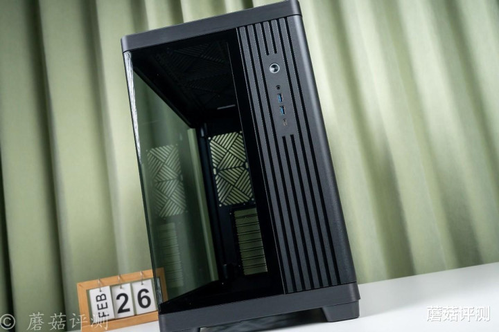 ▼机箱前部看过去,更大面积的是侧透部分,右侧有竖条格栅,上侧是IO面板,一个开机键,一个3.5mm音频接口,两个USB 3.0接口,一个Type-C接口。