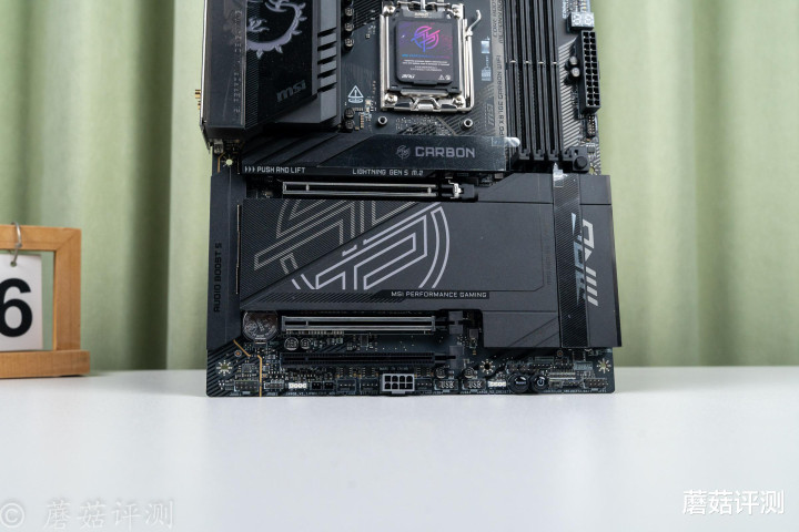 微星这块MPG X870E CARBON暗黑主板,整体的产品力很强,供电用料很棒,体验方面的细节设计也很棒,M2的金属覆盖件均支持快拆,主PCIe的锁扣也用特殊的机械设计,放到了主板的右侧,日常拆装显卡也很方便。
